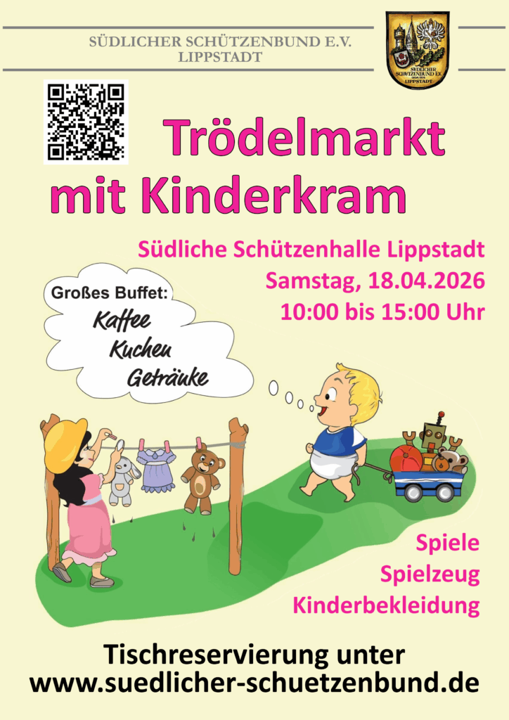 Der nächste Trödelmarkt findet am Samstag, dem 18.04.2026 von 10:00 bis 15:00 Uhr in der Südlichen Schützenhalle, im Weihewinkel 15, 59557 Lippstadt statt.