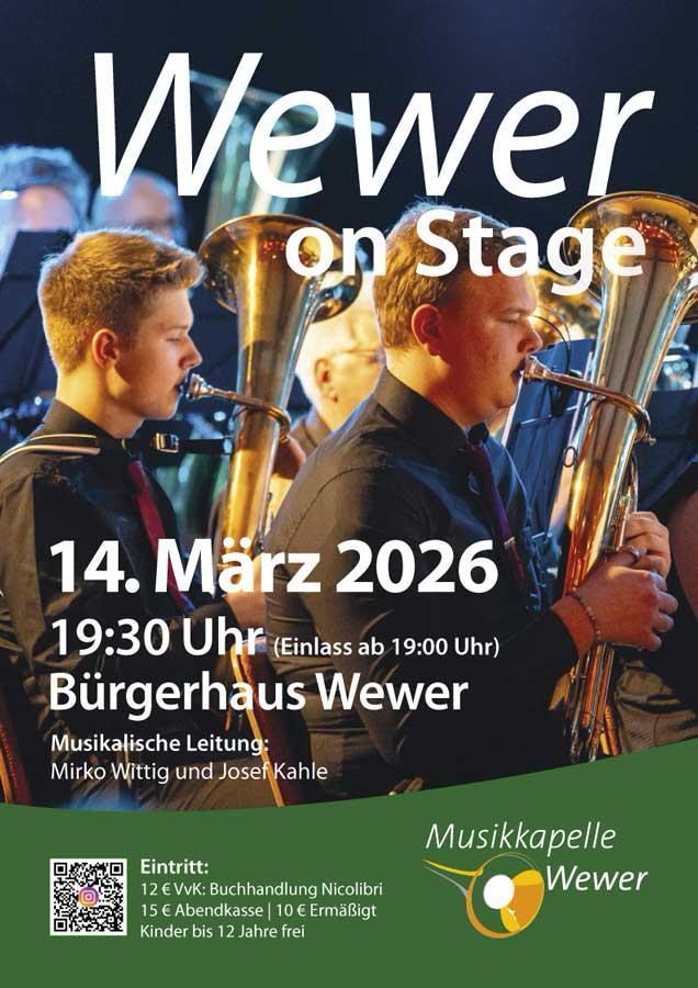 Auch in diesem Jahr dürfen wir uns wieder auf ein musikalisches Highlight freuen: Die Musikkapelle Wewer, die traditionell jedes Jahr unser Schützenfest begleitet und bereichert, lädt zu ihrem Frühjahrskonzert „Wewer on Stage“ ein.